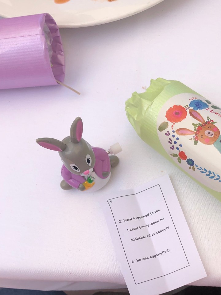 We all opened them and out popped a little wind up bunny that jumps around. All the jokes were told, we put on our crowns, and called it a day.